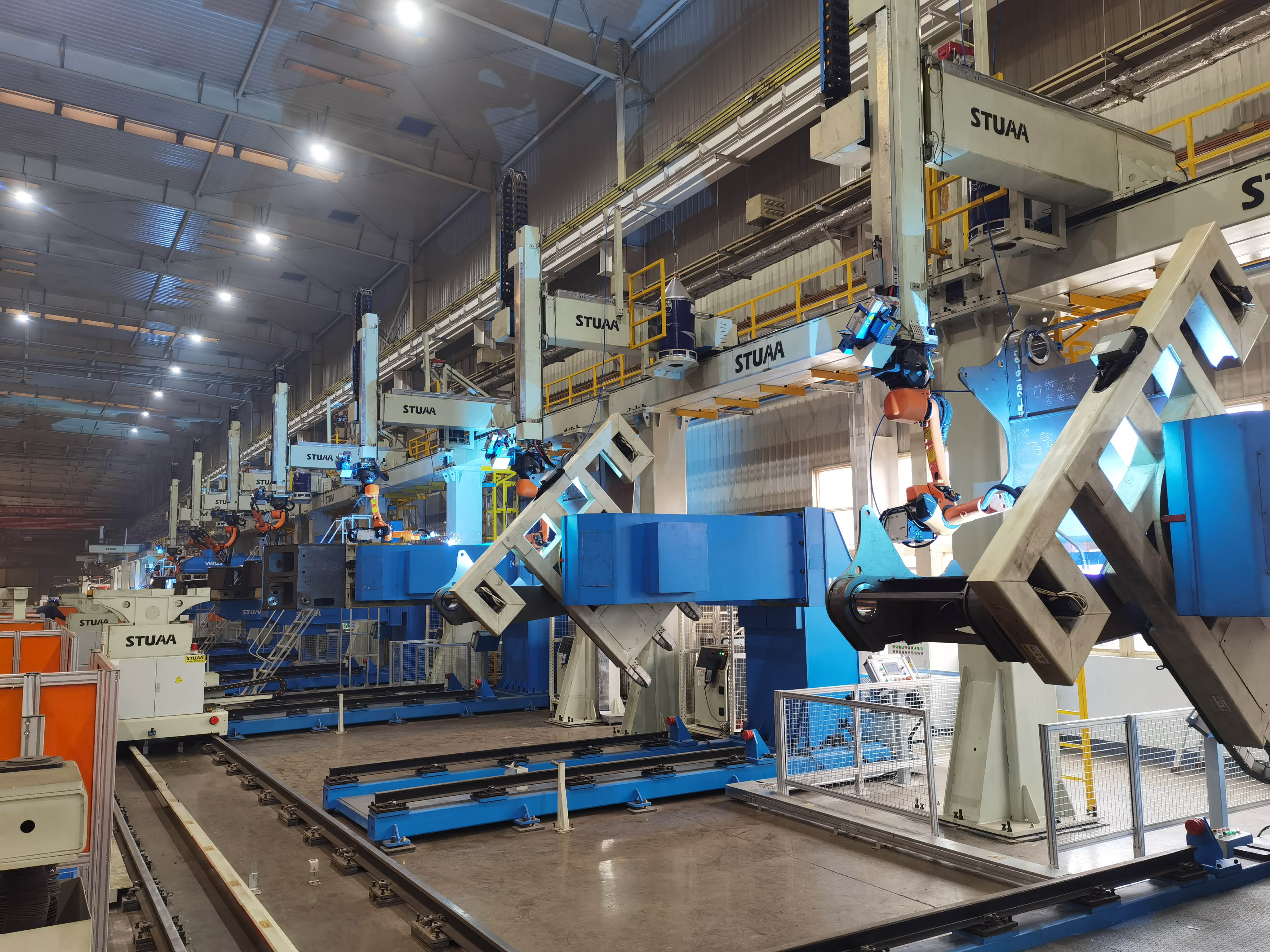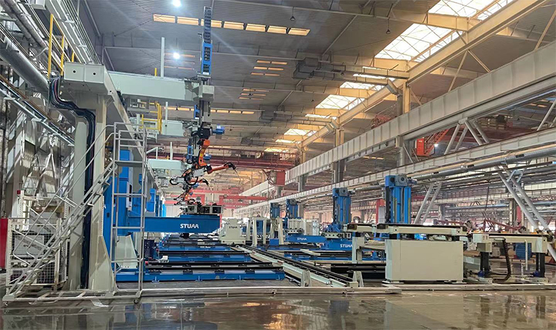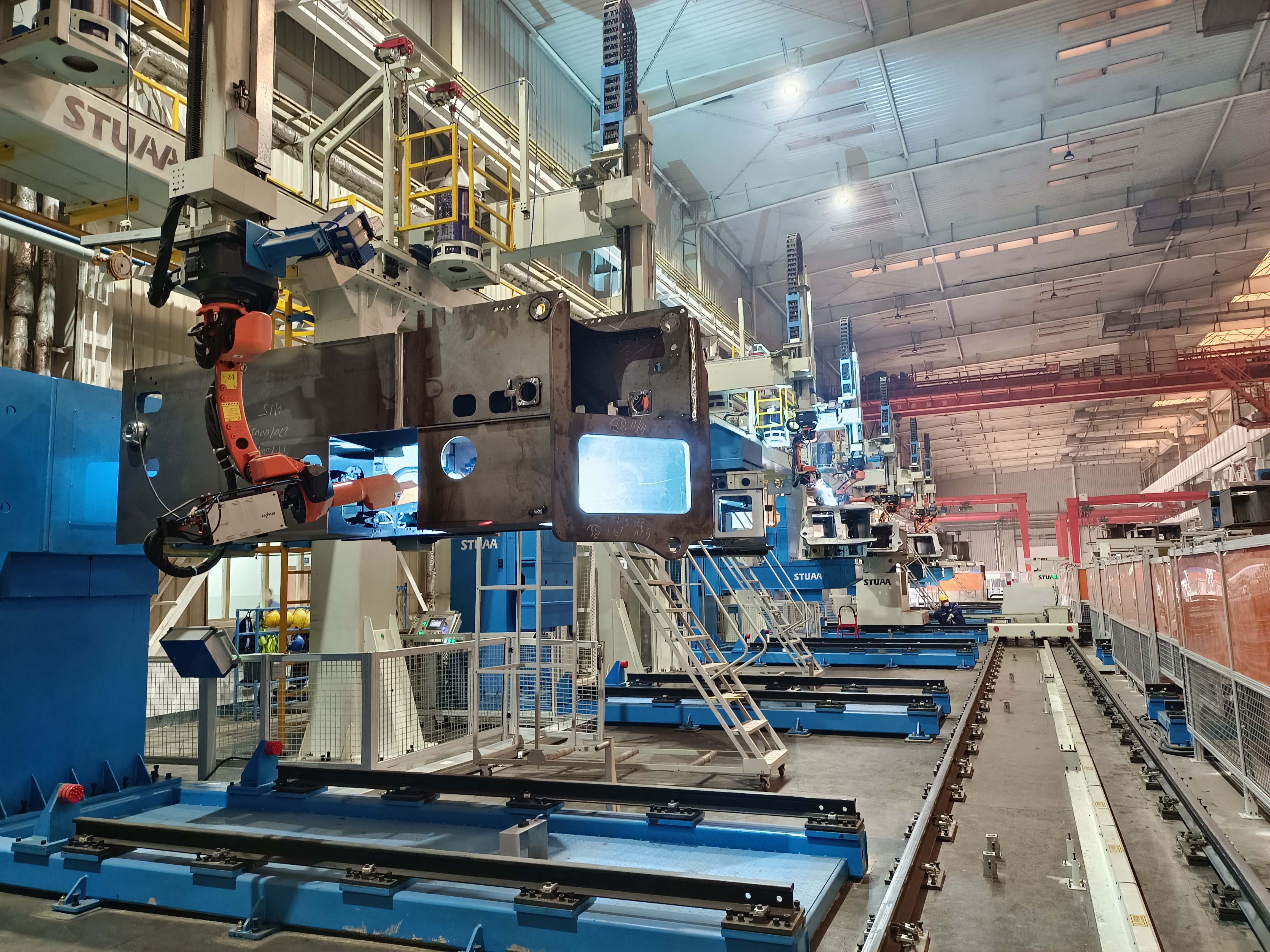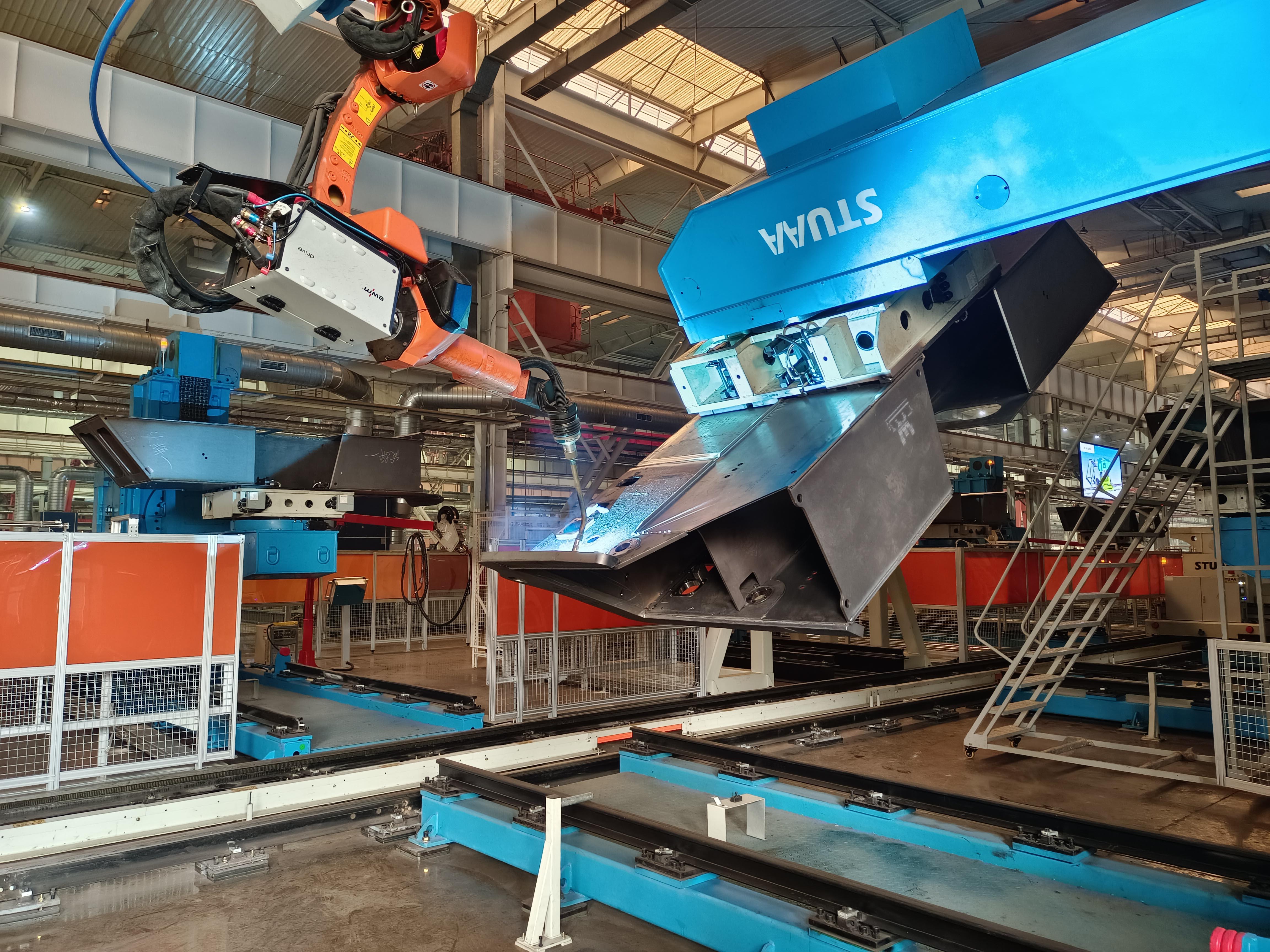 整条产线共有13台机器人和2台自动上下料RGV,分为东区和西区。整线实现了RGV自动识别指令,机器人自动调取相应的程序,全线可自动识别工件,自动夹紧,做到无人操作。东区包括圆筒组件和回转底座总体的自动化焊接,是整个产线自动化焊达率最高的部分,可达95%。产线总体正反两个面我们采用不同的自动化设备分别实现,有效提高自动化焊达率。回转底座智能焊接生产线是行业内的首条,不论从自动化水平、焊接质量还是生产效率、工人劳动强度等各个方面,都代表了行业最高水准。
